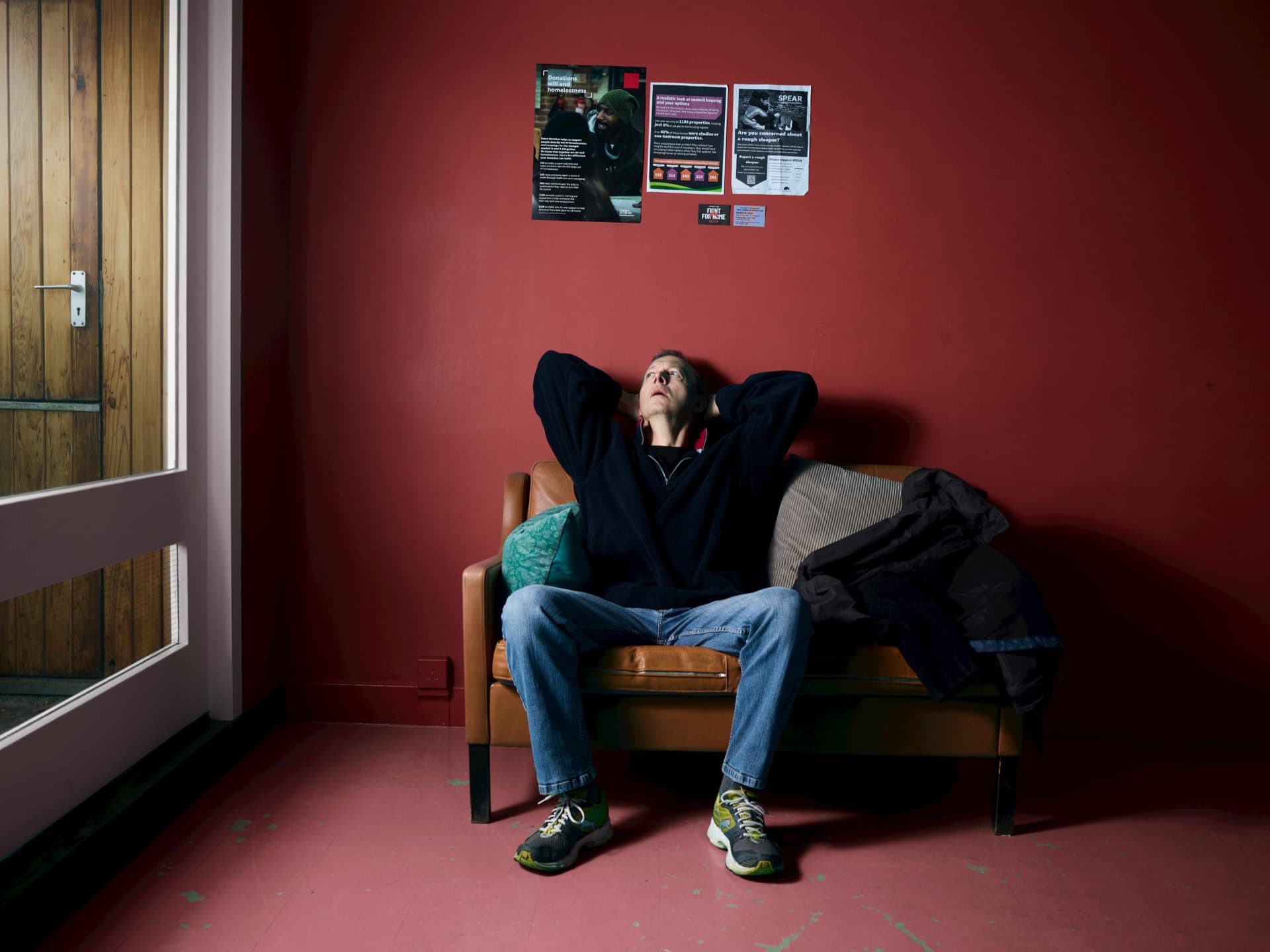 Ein Mann sitzt auf einem Sofa in einem Raum mit roter Wand, der an das MALEvolution Event erinnert, das für Männergesundheit und Selbstentwicklung steht.